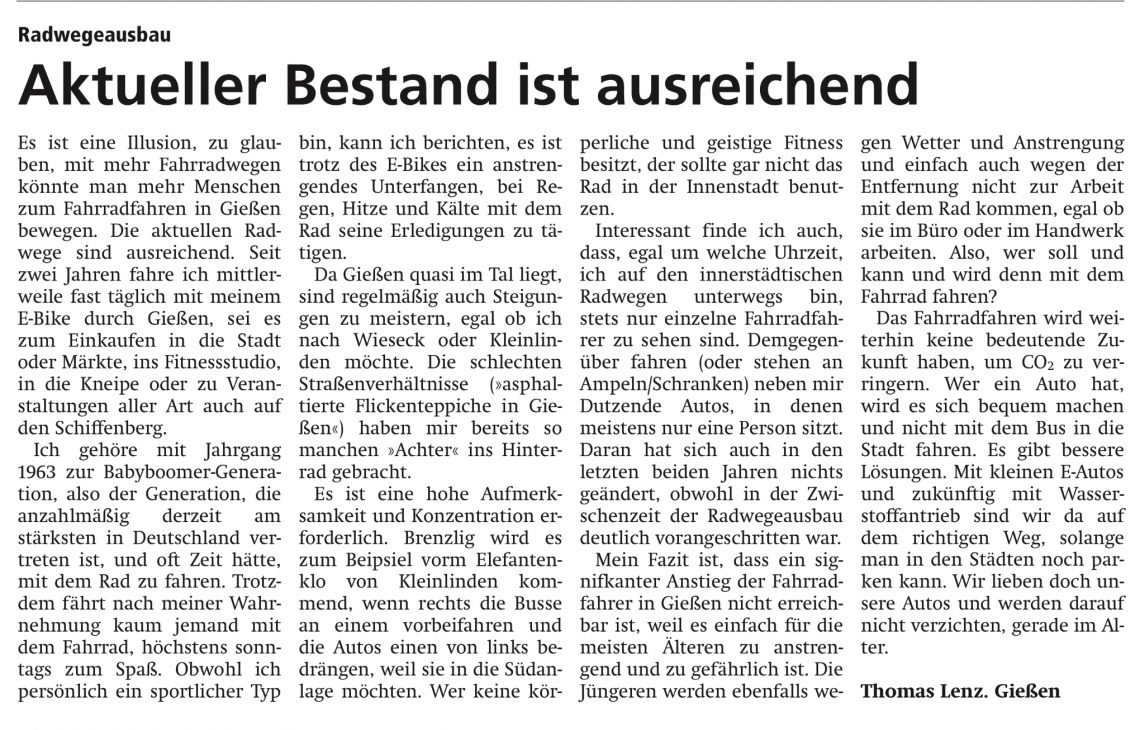 Der Leserbrief von Herrn Lenz entfachte den Wunsch nach Veränderung – wenn er sich gegen eine bessere Infrastruktur wendet, liefert er unfreiwillig starke Argumente dafür. In Gießen ist der aktuelle Radwegbestand eben nicht ausreichend: Nur mit sicherer, zusammenhängender, komfortabler Infrastruktur wird Radfahren zur echten Alternative – und zwar für alle. Die Erfahrung aus europäischen Städten zeigt: Wer baut, schafft Nutzer:innen – und gewinnt Umwelt, Gesundheit und Lebensqualität zugleich.